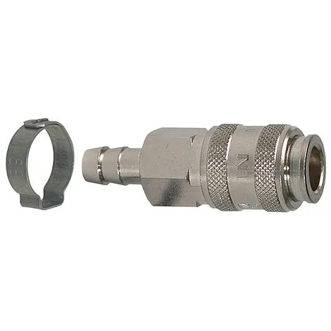 raccord automatique à bague avec système d’accrochage à billes en inox. cannelé pour tuyau Ø int. 10 mm. passage Ø 7,2 mm universel accepte embout iso 6150b. corps en laiton nickelé. livré avec collier de serrage